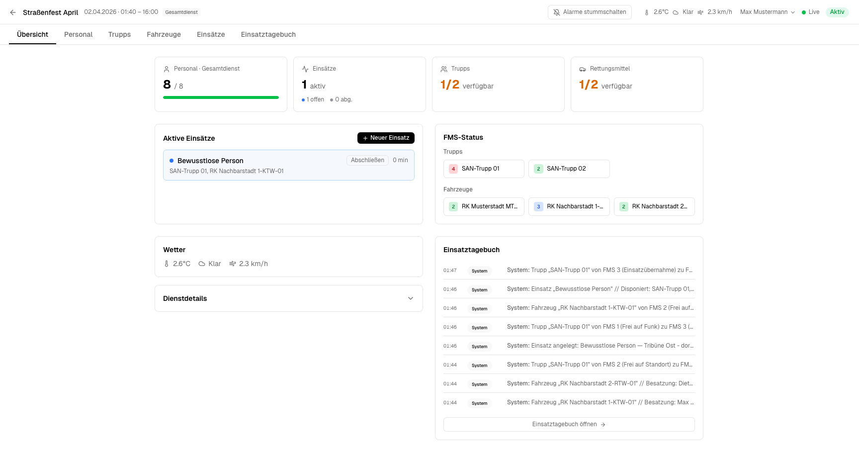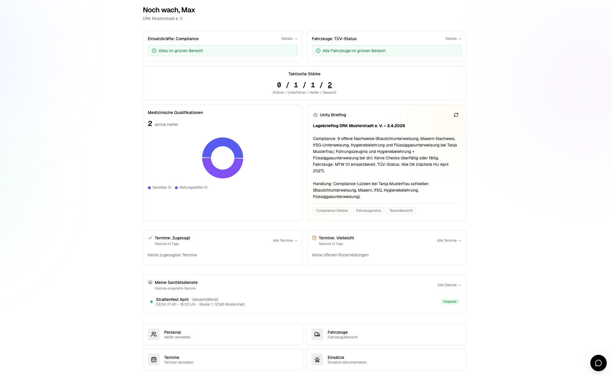 Die moderne Plattform für Verwaltung und Einsatzbetrieb von Hilfsorganisationen. Personal, Fahrzeuge, Sanitätsdienste und Einsatzdokumentation — alles an einem Ort.